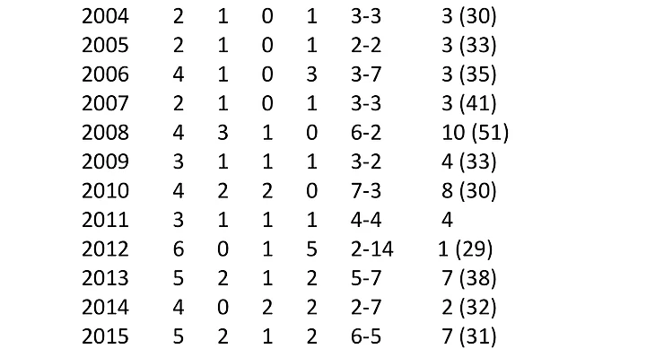 В этой табличке приведен баланс матчей красно-черных, сыгранных ими в ноябре и декабре за каждый сезон, проведенный «Амкаром» в РФПЛ. В последней колонке в скобках – количество очков, набранных командой за весь сезон. В 2011-м эти цифры отсутствуют, поскольку тот чемпионат был переходным, когда команды проводили трехкруговой турнир, а поздней осенью они как раз завершали первый этап и начинали второй. До этого ноябрьские матчи венчали чемпионат, а потом стали приходиться на конец первого круга и начало второго.