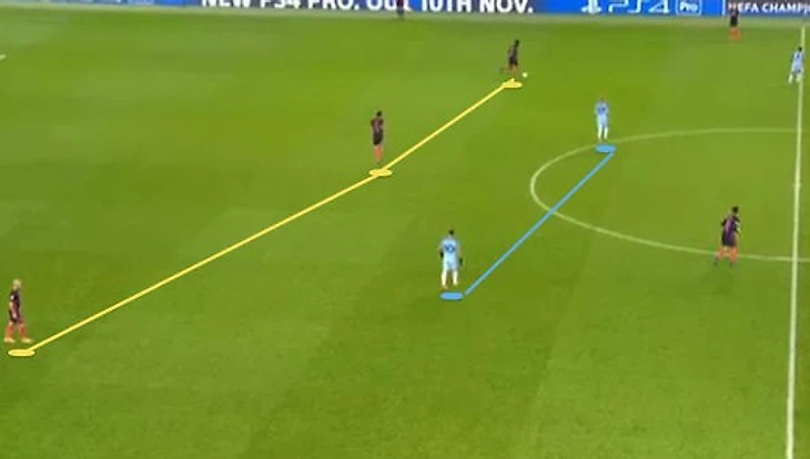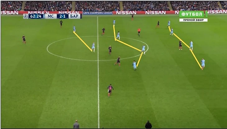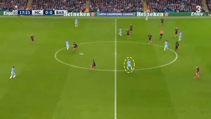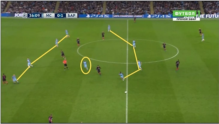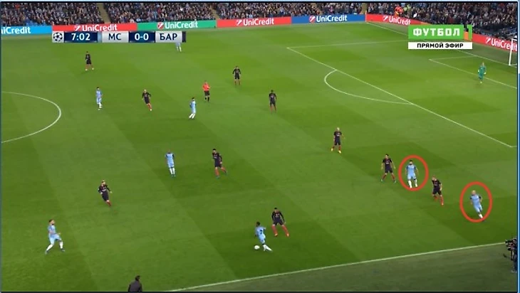 Забив второй гол, футболисты «Сити» начали пренебрегать высоким прессингом и принялись встречать соперника на третьей четверти половины поля «Барселоны», не оставляя свободных зон между линиями, которыми гости умело пользовались в первом тайме. При этом, хозяева продолжали использовать достаточно высокую линию обороны.