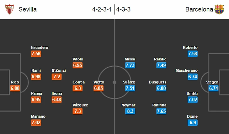 2. Матч начинался как нельзя лучше: «Барселона» сразу же забрала мяч и начала атаковать. Набеги сине-гранатовых в штрафную противника и острые прострелы записывались в протокол матча практически на каждой минуте, и уже спустя четверть часа после очередной перепасовки Месси смог открыть счёт, а ещё спустя пятнадцать минут Неймар забил со штрафного. Однако фортуна в тот вечер предпочла оставаться на нейтральной территории, поэтому все последующие заведомо голевые атаки были либо прекращены в зародыше благодаря умелому высокому прессингу, либо отражены стражем севильских ворот Серхио Рико (по крайней мере пять удачных сейвов были отмечены статистами матча).