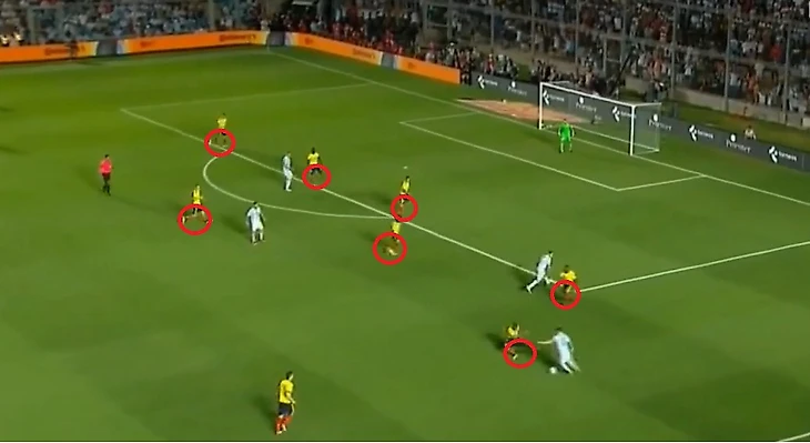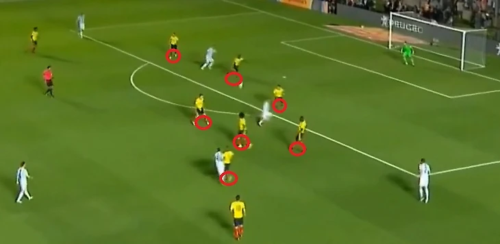 Обратите внимание в какой ситуации Лео принимает мяч. На подступах к воротам соперника целый оборонительный редут из семи человек. И вот этот эпизод ярким образом характеризует ту ситуацию, которая в последнее время скложилась в сборной Аргентины - отдай мяч Месси, а он что-нибудь придумает.