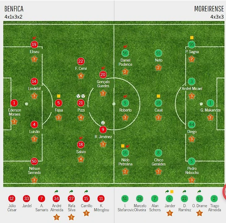 «Бенфика» дома принимала «Морейренсе», который прибыл на «Эштадиу на Луж» без главного тренера. Дело в том, что теперь уже предыдущий наставник «бело-зелёных» Пепа в начале недели был отправлен в отставку, а новый наставник ещё не назначен. По словам президента Витора Магаляэша, клуб не будет спешить с выбором главного тренера и, возможно, что встречу следующего тура команда вновь проведёт без рулевого. Выбирая состав на эту игру, тренер «орлов» Руй Витория неожиданно усадил на скамейку грека Митроглу, выпустив вместо него Хименеса. Впрочем, даже если бы наставник лиссабонцев перелопатил весь состав, выпустив полностью другой по сравнению со встречей против «Бешикташа» это никак бы не помогло гостям. Настолько слабо они выглядят в нынешней части сезона, что кажется один из коллективов отправляющихся на понижение уже определён. Правда прошлогодний пример «Тонделы» всё ещё оставляет надежды на спасение для фанатов «Морейренсе». Сама игра прошла, что называется «в одни ворота» и для «Бенфики» не составило труда одержать очередную победу и продолжить победную поступь к четвёртому чемпионскому титулу подряд.