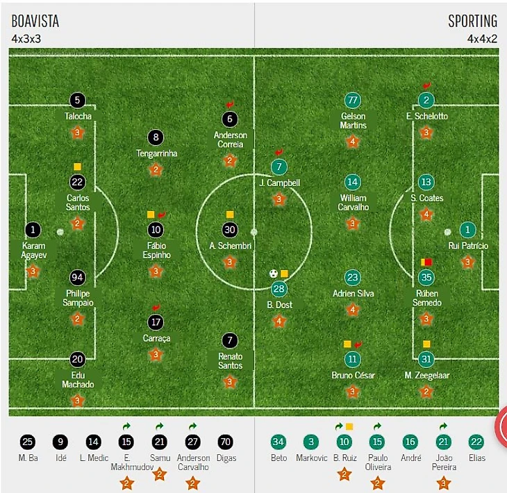 «Спортинг» в этом туре пожаловал в гости к набравшей в последнее время неплохой ход «Боавиште». Во многом этому успеху поспособствовала игра азербайджанского голкипера «пантер» Камрана Агаева, который после неудачного начала сезона стал одним из лидеров своей команды и по праву застолбил за собой пост номер один. Но и он был бессилен в начале игры, когда Дост сначала с близкого расстояния пробил в штангу, а затем в середине тайма всё же сумел открыть счёт, поразив цель с нескольких метров после навеса в исполнении Мартинша, для которого эта голевая передача стала уже шестой в нынешнем сезоне. По сравнению с игрой против «Реала» главный тренер «Спортинга» Жорже Жезуш сделал всего две перестановки в стартовом составе, убрав с поля проштрафившегося Перейру и костариканца Руиза, выпустив вместо них Скелотто и Жоэля Кэмбелла. И если итальянец с аргентинскими корнями провёл встречу на неплохом для себя уровне, то вот костариканец в очередной раз не сумел воспользоваться предоставленным ему шансом и во втором тайме был заменён на своего соотечественника. В целом же игра проходила полностью под преимуществом лиссабонского клуба, который в итоге и одержал минимальную победу, практически не позволив «Боавиште» создать хоть какую-то опасность у своих ворот. Единственной ложкой дёгтя в игре «Спортинга» стало удаление Рубена Семеду , который был отправлен в раздевалку незадолго до финального свистка.