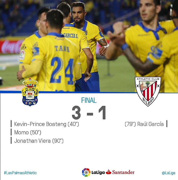 1. 13-й тур Ла Лиги завершился победой «Лас-Пальмаса» над «Атлетиком». Кевин-Принс Боатенг открыл счет в матче, но основные события развернулись после перерыва. При счете 2-0 в пользу «Лас-Пальмаса» с поля за две подряд желтых карточки (в течение одного эпизода) был удален Ариц Адурис. Без него, понятное дело, «Атлетику» и жизнь не мила.