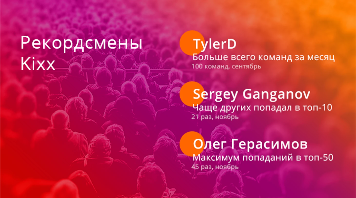 Ноябрьский рейтинг Kixx будет посвящен не только знакомству с обновленным топом игроков, но и подведению итогов сезона. Кто собрал больше всего команд? Кто побеждал чаще других или попадал в топ?