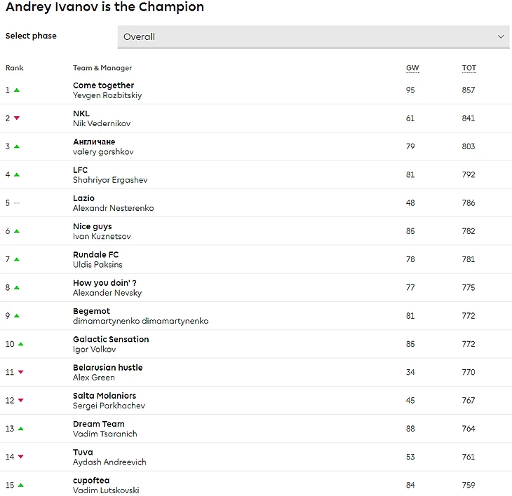 На первое место выбрался Yevgen Rozbitskiy и его команда Come together, показавшая отличный результат в 14-м туре. Отрыв от прошлого лидера Nik Vedernikov и его NKL — 16 баллов.