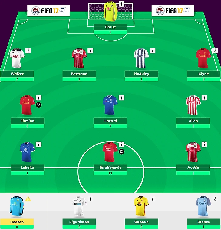 Перед туром было два бесплатных трансфера, которые использовал на замену Коутиньо — Стерлинга на Фирмино — Сигурдссон. Сам предлагал на прошлой неделе Кристиана Эриксена как один из вариантов, но выбрал расклад сложнее и прогадал. Надеюсь, что-то вернется на дистанции. В защите достойно выступил только Уокер, Марк Хьюз решил убрать Аллена из основного состава, а Лукаку и Остин подвели меня точно так же, как и лидера лиги. Хорошо хоть Боруц все-таки успел восстановиться после травмы и накинул балл моей горе-команде.