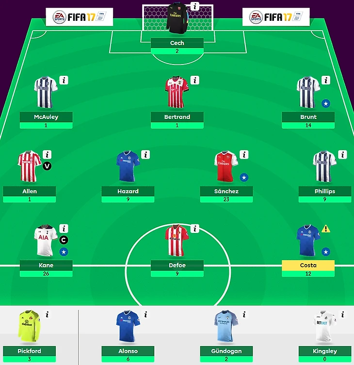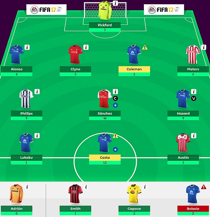 Yevgen Rozbitskiy сделал 2 трансфера и потерял 4 очка, но набрал великолепные 95 очков. Наличие и капитанство Алексиса Санчеса — это те моменты, которые определяли успешность тура для всех фэнтези-менеджеров на FPL. К 46 очкам чилийца были добавлены 6 очков гиператакующего Алонсо и 6 очков скромного Питерса. Больше из защиты никто не проявил себя, а вот два оставшихся полузащитника выдали отличные матчи и принесли по 9 очков — Филлипс и Азар в прекрасной форме. В атаке были два неудачника с 1 очком (Лукаку и Остин) и неподражаемый Диего Коста, который лишь в одном из последних 8 матчей уходил с поля без результативного действия.