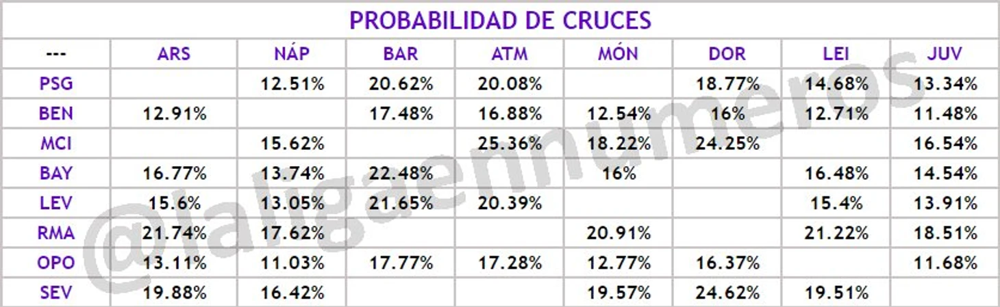 С наибольшей вероятностью (21, 74%) соперником «Мадрида» в 1/8 финала Лиги Чемпионов станет лондонский «Арсенал», далее следуют «Лестер Сити» (21, 22%), «Монако» (20, 91%), «Ювентус» (18, 51%) и «Наполи» (17, 62%).