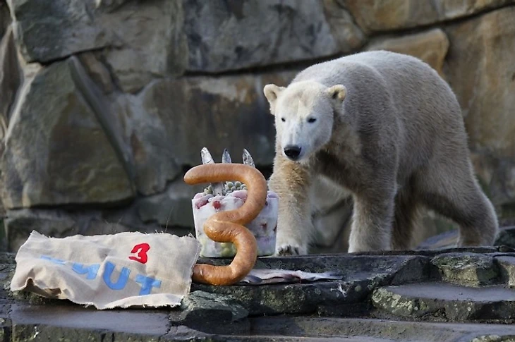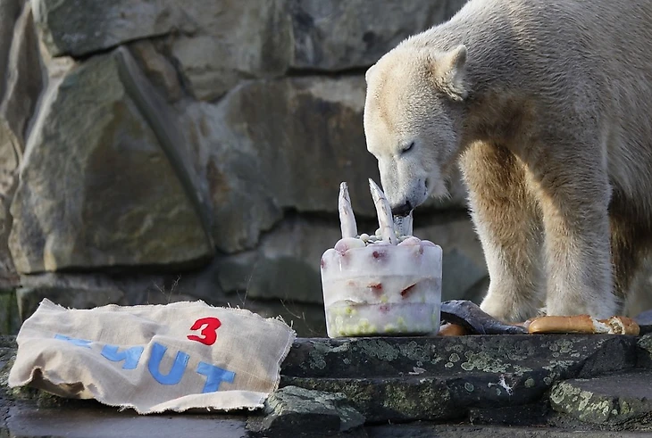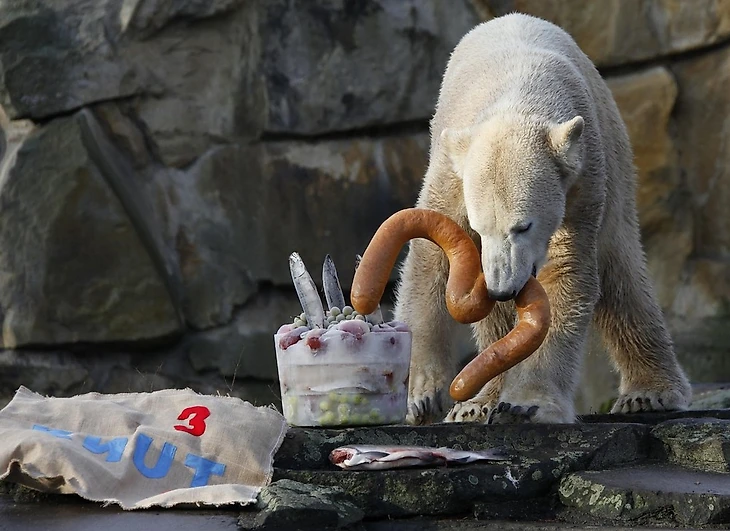Белый медведь Кнут из берлинского зоопарка отпраздновал свой третий день рождения. По такому случаю смотрители устроили ему мини - пирушку в виде торта из замороженных фруктов, рыбки и огромной, колбасной цифры "три".