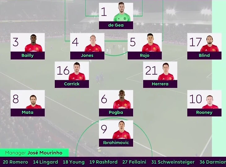 По сравнению с матчем против Тоттенхэма Моуринью произвел 4 замены. Дисквалифицированного Валенсию заменил Байи, Дармиан уступил место Блинду, вместо травмированного Мхитаряна вышел Мата, Руни вышел на позицию Марсьяля.
