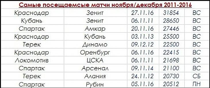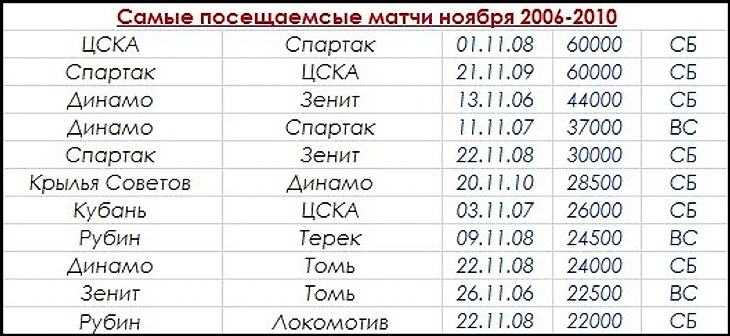 В те далекие года московское «Динамо» еще проводило игры не в Химках и не в ФНЛ, а на родном стадионе. Сразу три самых посещаемых игры того периода прошли на стадионе «Динамо». Его планируют открыть зимою 2018 года, так что вполне вероятно, что некоторые игры будут иметь такую же приличную посещаемость. В топе также две игры «Рубина» - в тот ноябрь казанский клуб впервые стал сильнейшей командой страны. Матч против «Локо», когда команду наградили «золотом», стал 11 в списке. И сразу 7 команд принимали матчи из этого топа, что является великолепным результатом. Тут нужно отметить, что по старой схеме ноябрьские матчи были самыми важными и принципиальными и потому собирали людей на трибунах вне зависимости от погоды. Болельщики готовы были терпеть мороз ради накала и турнирной борьбы. Сейчас же все понимают, что перерыв в три месяца может кардинально изменить расклад в чемпионате и потому внимания стоит уделять лишь весенний играм, да и то только, начиная с начала апреля, хотя чемпионат стартует в марте.