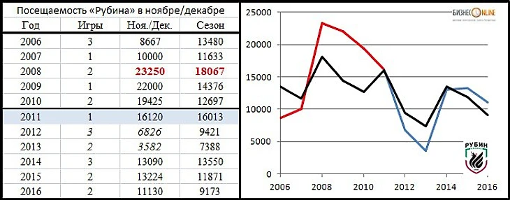 Вот таблица и график посещаемости нашего казанского «Рубина». Красноречивое свидетельство того, как неграмотный подход к работе с болельщиком (смена эмблемы, постоянные склоки и изменения курсов развития) может разрушить все то, что строилось годами. Средняя посещаемость ноябрьских матчей в 23 тысячи человек? Это просто космос для нашей лиги, хотя стоит признать, что это были всего два матча, да и те – чемпионские.