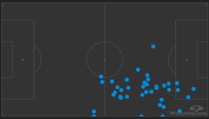 На схеме отображение передач Сарра в тяжелейшем матче с ПСЖ. 40 пасов, точность 83,8%. Не совершил грубых ошибок, играя в зоне против Ди Марии и Верратти, параллельно страхуя бразильца Далберта.