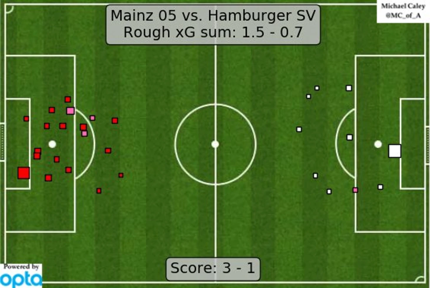 «Майнц» активно начал встречу, доминируя на поле по всем пунктам статистики, но на 21-й минуте голом отличился Вуд. Более того, через пять Гамбург чуть было не увеличил отрыв, но на месте оказался Лессль. Сравнять хозяевам удалось за десять минут до перерыва – после ошибки защитника Латца забил свой первый мяч. Первый тайм команды закончили со счетом 1:1, хотя заметно оживившийся «Майнц» приложил немало усилий, чтобы выйти вперед еще до перерыва.
