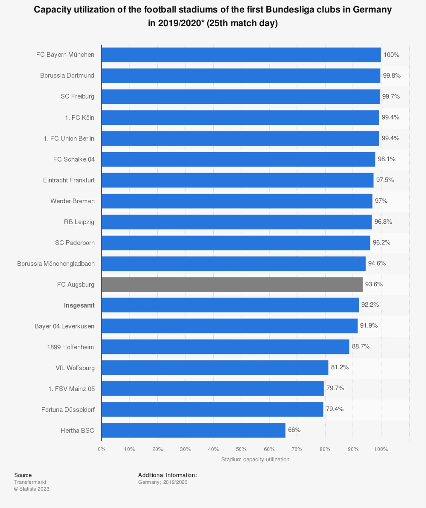 Процентное соотношение заполняемости трибун к общей вместительности футбольных стадионов клубов первой Бундеслиги в сезоне 2016/2017.