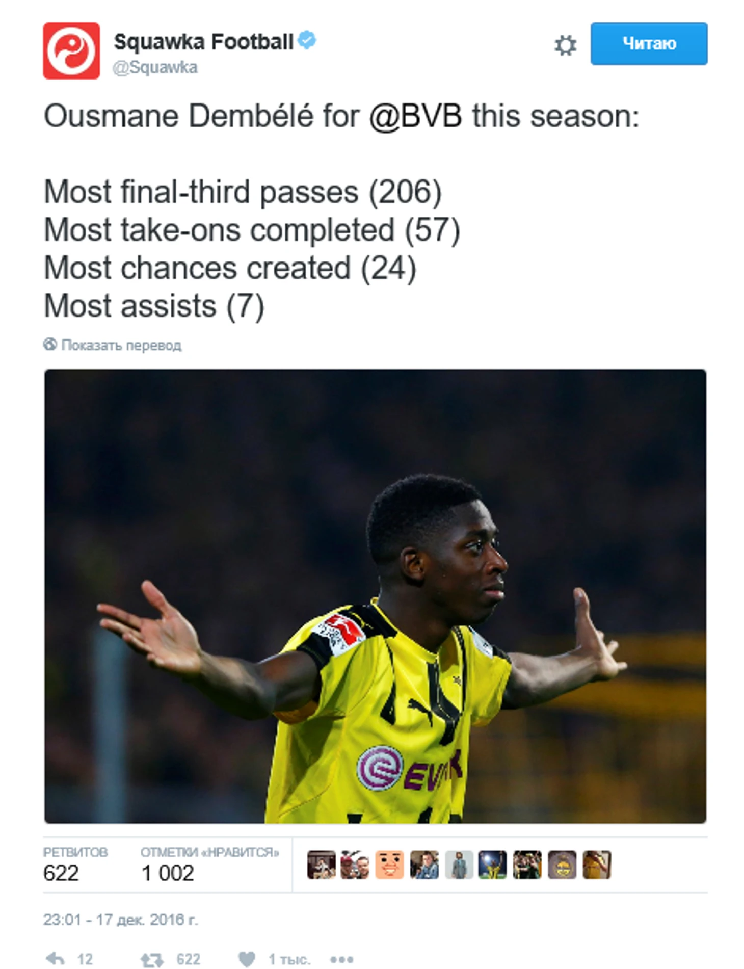 Марко Ройс в сезоне 2016/17 каждые 39.9 минуты оказывается причастным к забитому голу. Стоит также отметить, что этот показатель, является лучшим среди игроков пяти ведущих чемпионатов.