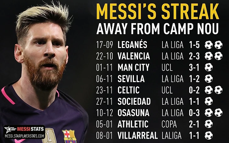 Лео Месси в матче с Вильярреалом продлил свою голевую серию в гостевых матчах (9 игр, 13 голов).