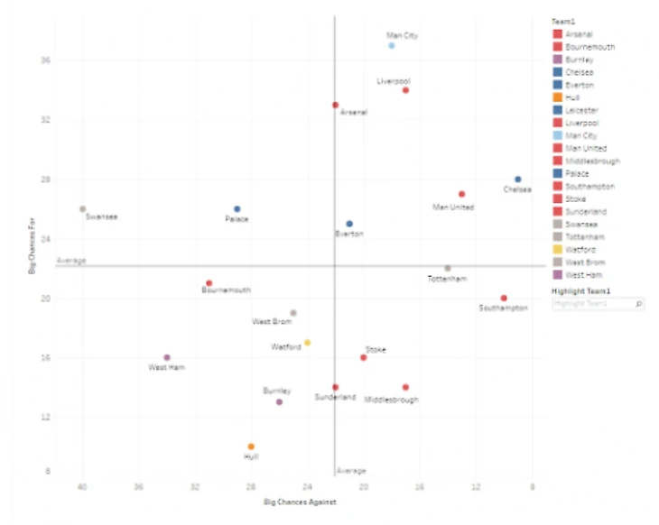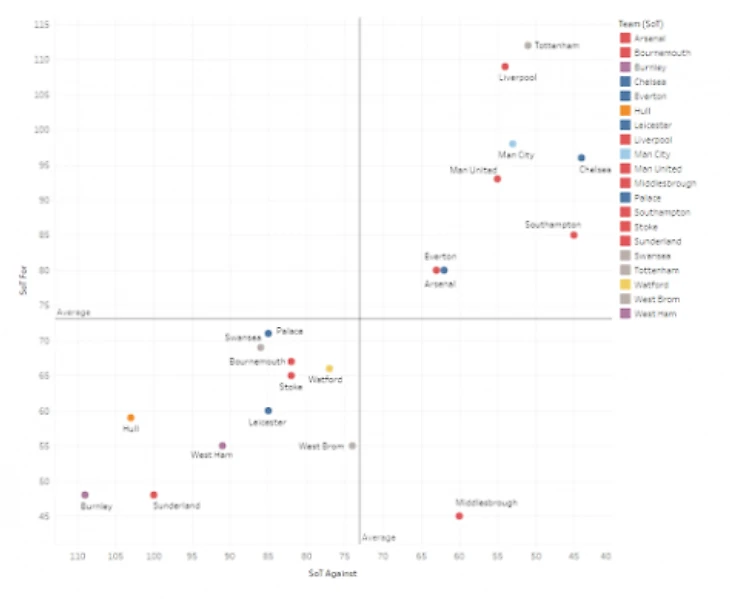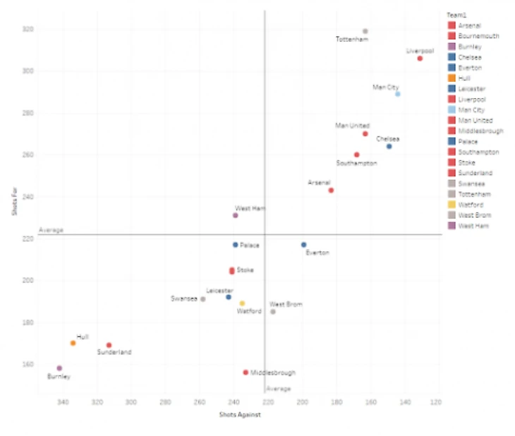Как вы видите, показатель Кристал Пэлас чуть ниже среднего. И хотя они не борятся за место в Лигу Европы, они и не должны бороться в зоне вылета. Соотношение их ударов показывают, что они должны занимать позицию выше от той, что занимают сейчас.