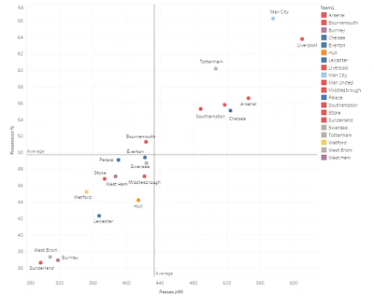 Какую тактику использовал Пардью в работе с Кристал Пэлас? Сначала посмотрим, использовал ли Пардью стиль Гвардиолы или Моуриньо. Сначала посмотрим на эту схему (созданную Эдом Шортхаусом, как и все остальные), которая показывает сколько пассов сделали команды АПЛ и сколько они контролировали мяч.