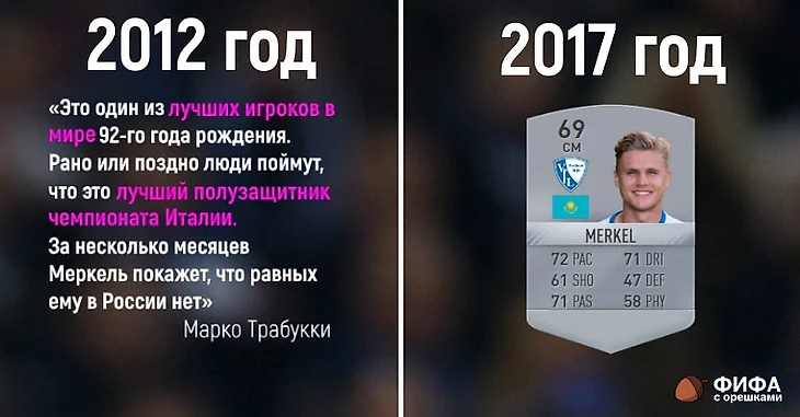 Тот самый Александр Меркель, который играл в Милане и хотел выступать за сборную России, решил выступать за Казахстан и сейчас почти не играет во второй Бундеслиге. Улыбается, но выглядит грустно.