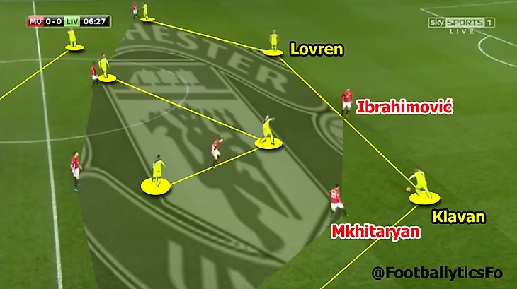 4-4-2 даймонд «Ливерпуля». Клопп к матчу на «Олд Траффорд» отступил от классических 4-3-3 (отсутствие флангов в лице Мане и Коутиньо), выпустив двух форвардов – к Фирмино добавился Ориги – и четверку хавбеков в форме узкого ромба с Лалланой впереди и Хендерсоном сзади. Подобный ход был сделан с целью получить преимущество в центре поля: из-за низкой позиции Каррика и движения Фирмино или Лалланы в полузащите создавались изоляции 4-в-2 и 3-в-2 соответственно. При позиционной обороне команда переходила на простые 4-4-2 в линию (где Хендерсон обязательно был центральным, а Лаллана почти всегда – крайним), пытаясь не допустить продвижения мяча на свою половину. В случае, если это все же происходило, Ориги уходил на левый фланг, Адам – на правый, а Фирмино оставался на острие: таким образом, команда переходила на компактные 4-5-1, изолируя Ибрагимовича на позиции форварда и держа под контролем фланги атаки соперника.