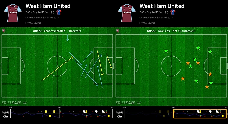 Позиционные атаки «Сандерленда». «Коты» играли короткими и средними передачами гораздо больше, чем в среднем по сезону, в то время, как количество дальних передач осталось прежним. Однако с созиданием в позиционной игре у «Сандерленда» большие проблемы: Родуэлл и Денайер не лучшие кандидаты для продвижения мяча вперед, Борини и Янузай часто теряли мяч, поэтому больше всего остроты исходило от дальних передач. Так был и забит мяч. Проблема в том, что точность дальних передач была нереально низкой (всего 40%, с отрывом последний результат в туре и почти на 20% хуже своего среднего показателя), а потому создавать остроту у ворот Гранта не получалось. Два же самых опасных момента, не считая гола возникли после ошибок игроков «Стока».