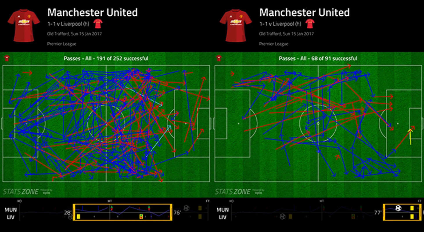 Стерильные передачи «МЮ» до выхода Феллайни (справа), более прямолинейный стиль и мяч в более острых зонах в концовке (слева)