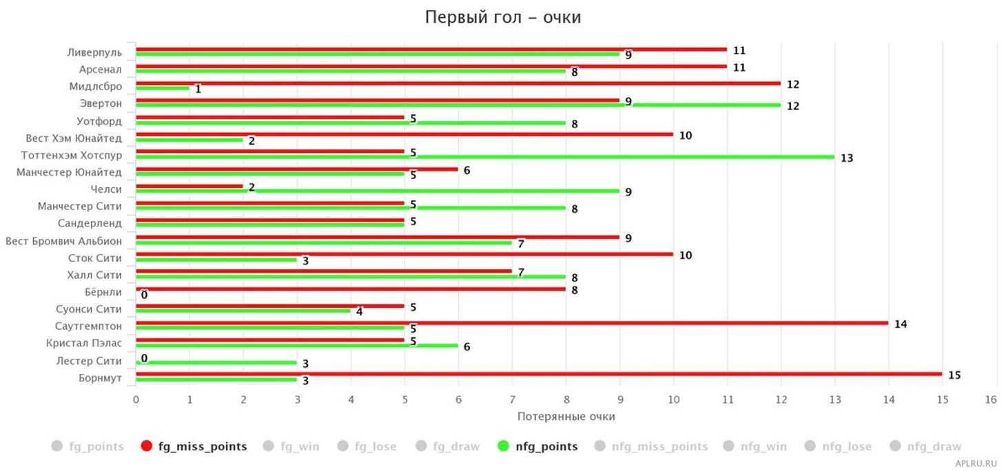 Противоположный показатель это набранные очки в матчах, где команда первой пропускает. Тут равных нет Тоттенхэму, шпоры набрали 13 очков, пропуская первый гол в матче. На втором месте идет Эвертон с 12 очками, третье место с 9 очками делят Ливерпуль и Челси.