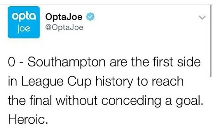 По ходу нынешнего розыгрыша Кубка Лиги Саутгемптон установил рекорд, став первой командой в истории кубка, не пропускавшей голы на пути к финалу. Данная информация нашла подтверждение в Твиттере Opta sports.