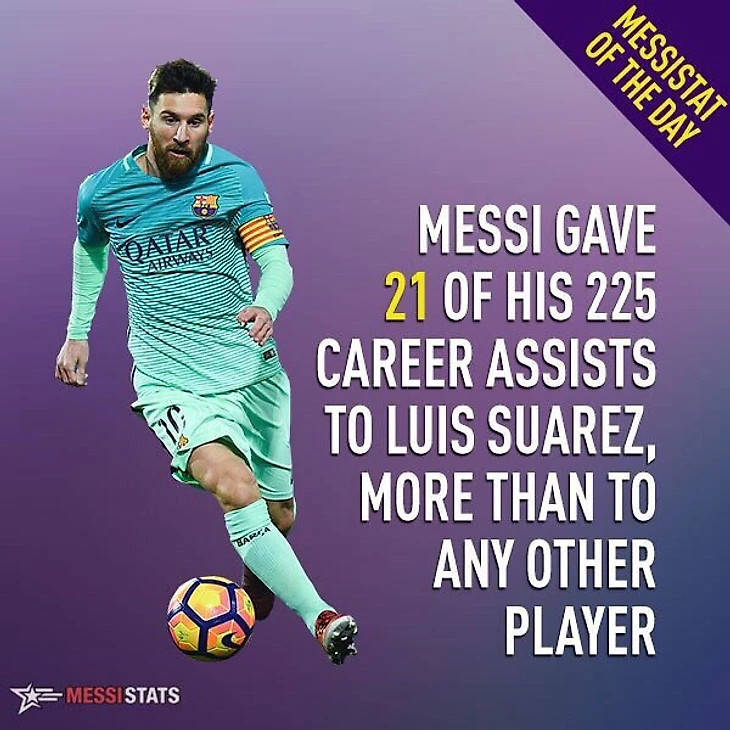 Из 225 голевых передач в карьере 21 Месси отдал на Луиса Суареса. Это больше, чем на любого другого игрока.