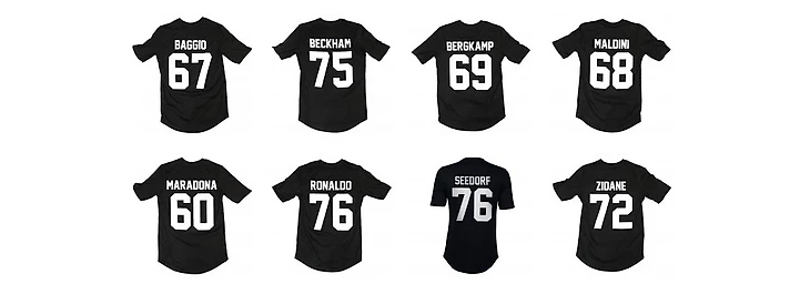 Одной из главных фишек стали футболки с фамилиями мировых звезд футбола, на спине у которых вместо привычного номера указан год рождения футболиста. Двузначные цифры на спине напоминают спортивные футболки и свитеры, которые так популярные в США и постепенно перекочевали со спортивных площадок на плечи рэперов, а после пошли в массы.