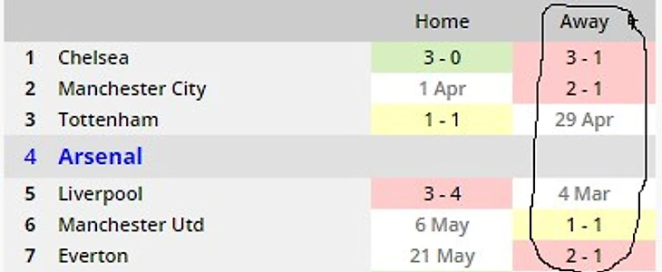 В АПЛ с командами топ-7 на выезде Арсенал смог добыть лишь 1 ничью (МЮ 1:1), проиграв 3 матча (Челси 3:1, МС 2:1, Эвертон 2:1).