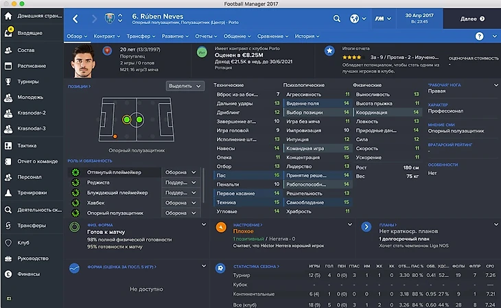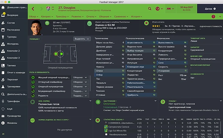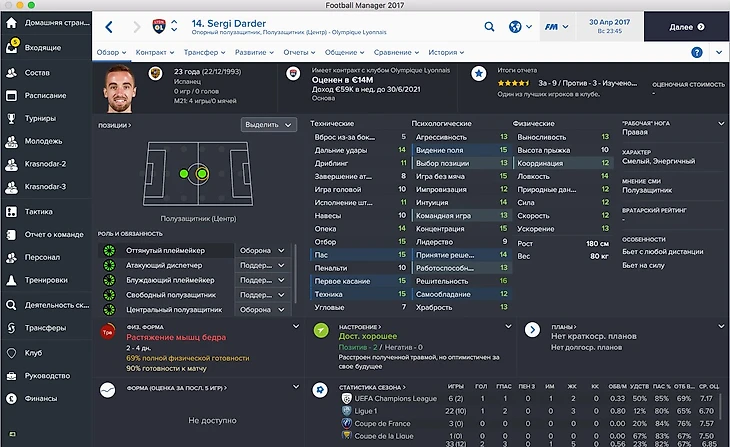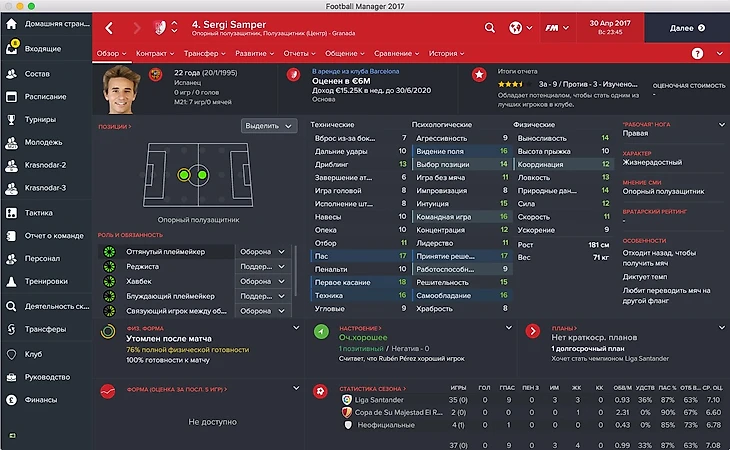 Серги Сампер начинает карьеру в FM 17 в аренде за «Гранаду», команду, которая славится высоким темпом игры. Физика — не его конёк, но он всё равно очень хорош для этой роли (см. показатели).