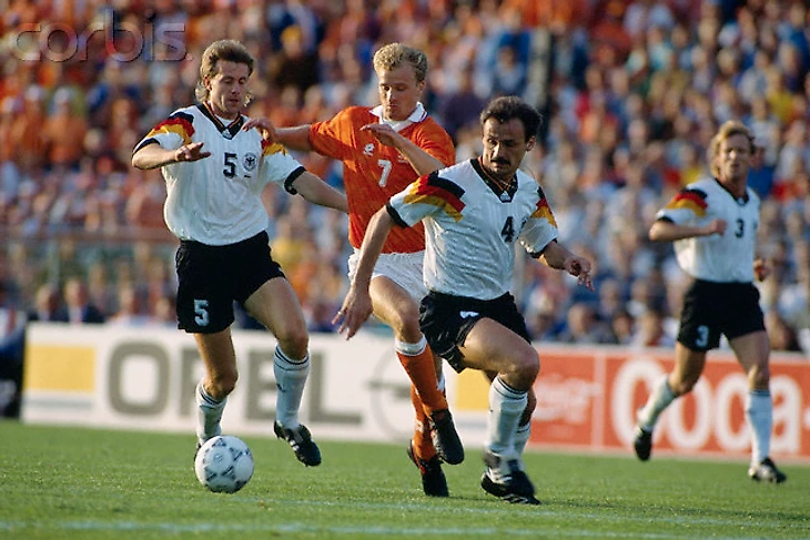 Счет этого матча говорит сам за себя. Охарактеризовать его можно одной фразой - в одну калитку. Уже к 15 минуте матча действующие чемпионы Европы выносили действующих чемпионов мира вперед ногами со счетом 2:0. На 4-й минуте Рейкаард доказал, что он умеет не только плеваться в немцев, но и забивать им, затем Витчге на 15 минуте нарисовал на табло неприличные 2-0, а добил тевтонов молодой и еще летучий Деннис Бергкамп (аэрофобия на этого форварда мирового уровня нападет спустя два года). Немцев хватило лишь на гол Юргена Клинсманна на 54 минуте. Кстати именно в этом матче автор этих строк будучи шести лет от роду впервые увидел на экране зомбоящика человека по фамилии Адвокаат, бывшего тогда ассистентом великого Михелса и не помышлявшего даже о зарплате в 7 миллионов Евро. Результат должен был оставить немцев за бортом группового турнира, но пресловутые "пьяные шотландцы" в параллельном матче неожиданно для всех бахнули сборную СНГ и подарили сборной ФРГ путевку в полуфинал.