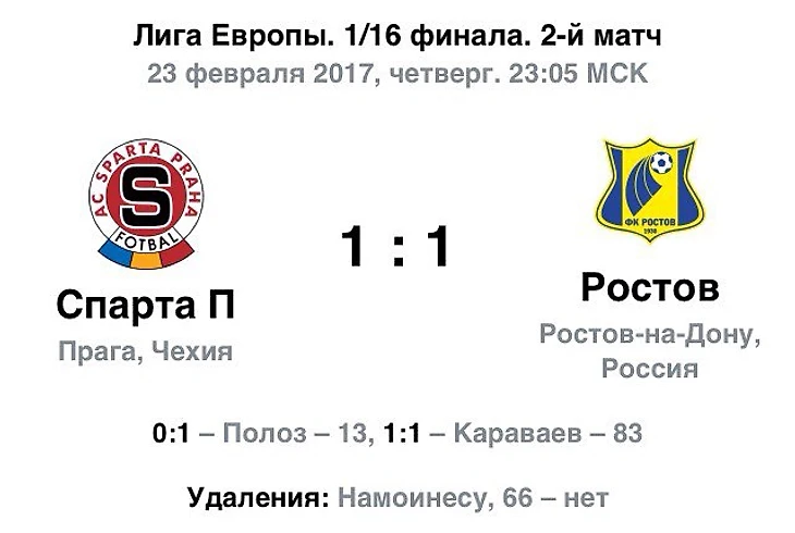«Ростов» вышел в 1/8 финала Лиги Европы, несмотря на гол Караваева«Ростов» не удержал победу над «Спартой» в ответном матче 1/16 финала Лиги Европы. Встреча проходила в Праге на стадионе «Дженерали Арена — Летна» и завершилась со счётом 1:1. На 13-й минуте Александр Ерохин прострелил по линии штрафной в центр на Александра Бухарова, который технично обработал мяч и забросил его вглубь штрафной, куда устремился Дмитрий Полоз и спокойно пробил в правый угол. В середине второго тайма Коста Намоинесу ударил локтем Сердара Азмуна и получил вторую жёлтую карточку. На 84-й минуте экс-игрок ЦСКА Вячеслав Караваев подключился к атаке по правому краю, получил мяч на краю штрафной, сместился в центр и пробил в дальнюю девятку.«Ростов», победивший в первом матче со счётом 4:0, вышел в 1/8 финала Лиги Европы. «Спарта» покинула турнир.