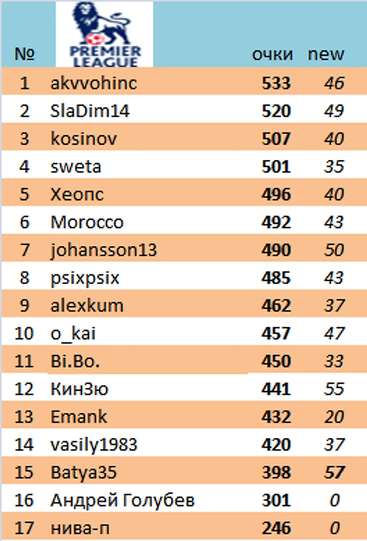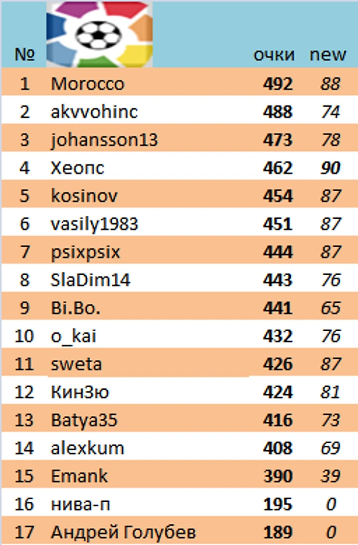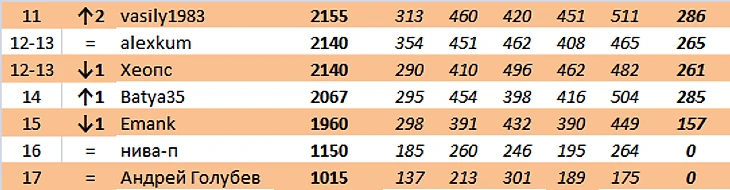 Примечание : при равенстве очков kosinov/SlaDim14 и alexkum/Хеопс все решил показатель