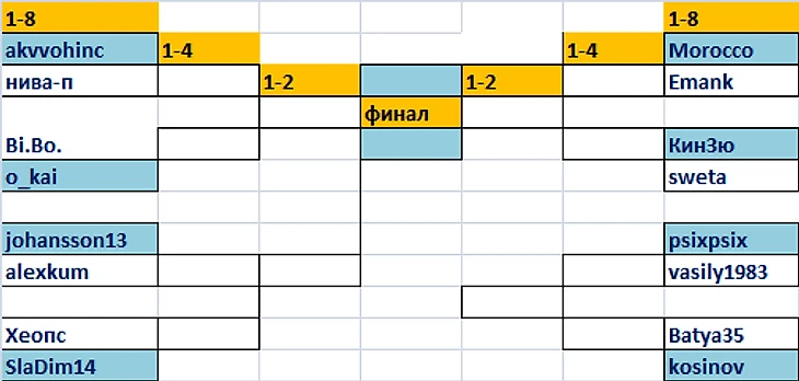 По аналогичной схеме (3 недели) с нуля пройдут матчи 1/4 и 1/2.