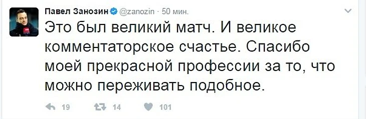 Павел Занозин, между прочим, также блестяще справился со своими комментаторскими обязанностями, как во время матча, так и после него в Твиттере: