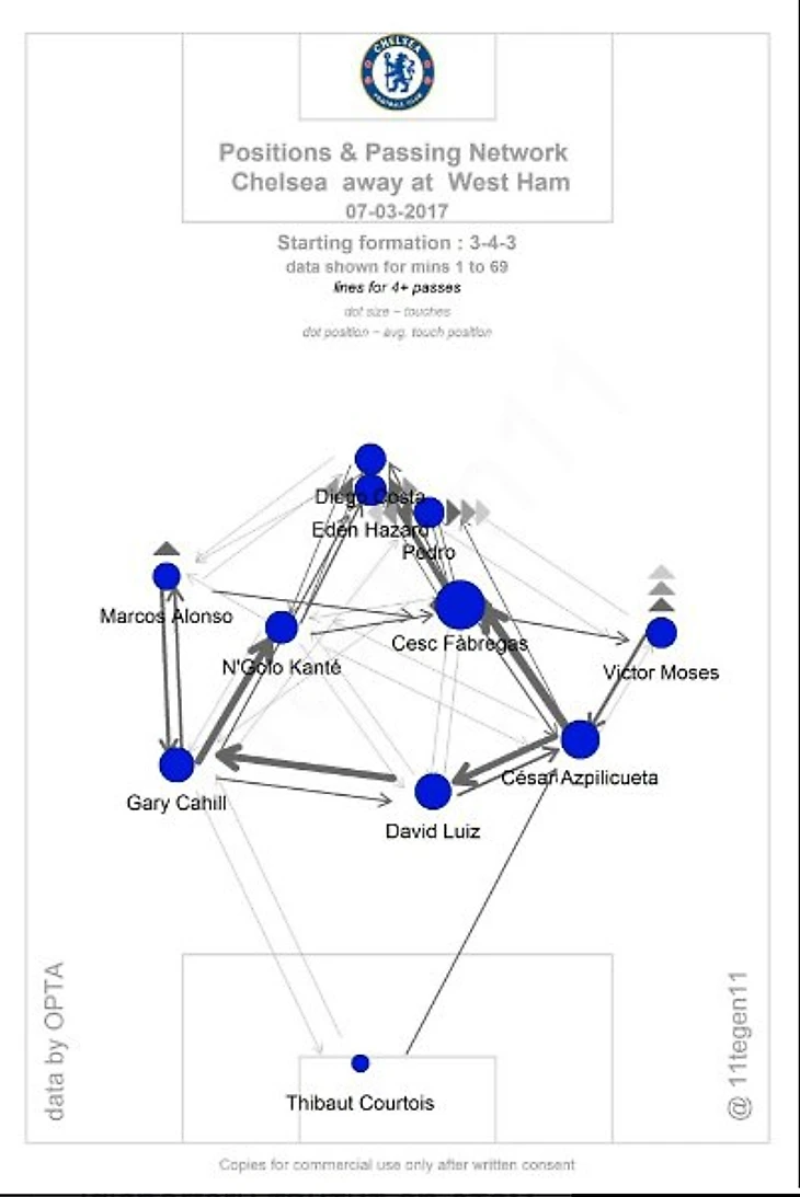 Карта передач «Челси» в матче с «Вест Хэмом». Обратите внимание на количество пасов Аспиликуэты на Фабрегаса и преимущество правой стороны в создании моментов для атакующей тройки