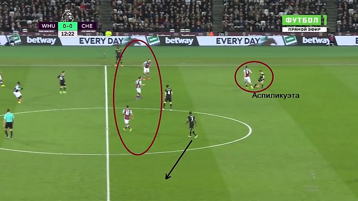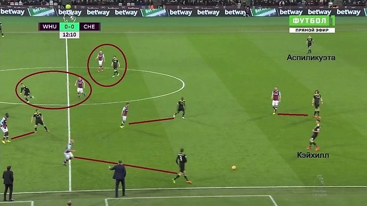 Снодграсс давил на зону Аспиликуэты, а сам испанец даже не пытался как-либо нейтрализовать «пыл» шотландца. Наоборот, выступил в роли матадора и стал дразнить быков красной тряпкой. Передерживал мяч и стягивал еще и Энди Кэролла от Давида Луиза. Вместе с ними приближался к флангу и центр «молотобойцев», а Фегули – к центру. В результате, «либеро» Луиз оставался свободен и мог: отдать длинный пас прямо атакующей тройке, перевести мяч на освобожденный левый фланг.