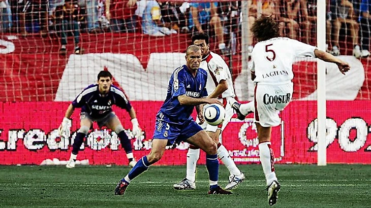 Защитник «Севильи» Серхио Рамос лупит то ли по воротам «Реала», то ли по Зидану.