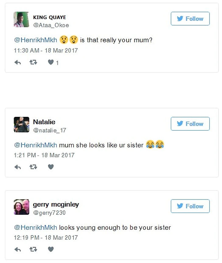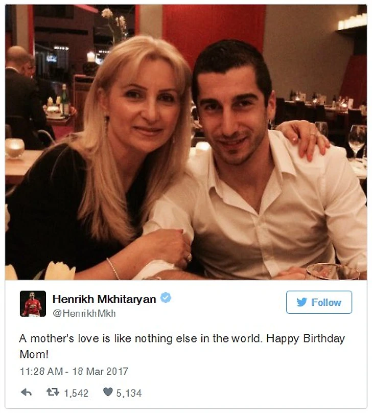 Генрих Мхитарян опубликовал в своем твиттере фотографию со своей мамой. У нее был День рождения. Болельщики «Юнайтед» и лично Генриха не верят, что это его мама! Марина (мама) выглядит очень здорово, вот и посыпались твиты: