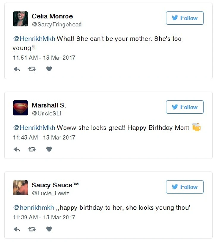 «Это правда твоя мама?»; «Мама? Она выглядит как твоя сестра!»; «Молодая, должно быть твоя сестра»; «Что!? Это не твоя мама! Она слишком молодая!»; «ВОУ! Она выглядит прекрасно! С Днем Рождения, мама.»; «С Днем Рождения, все равно она выглядит молодо».