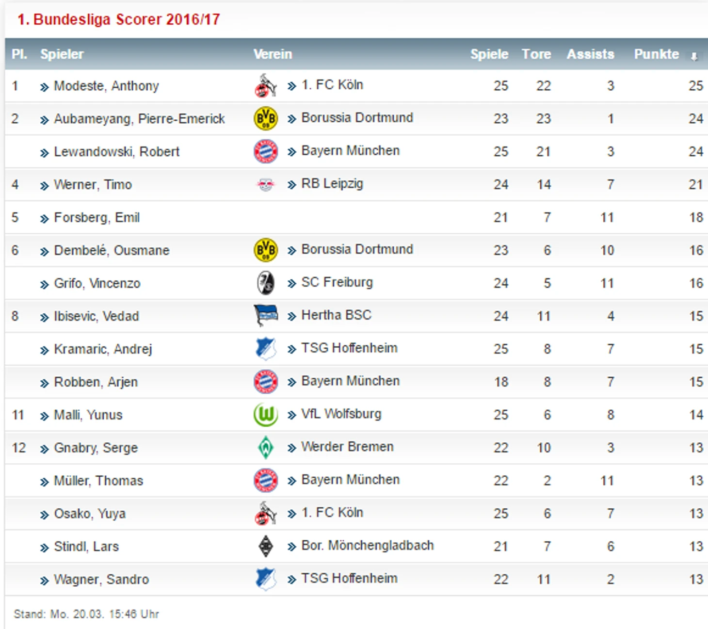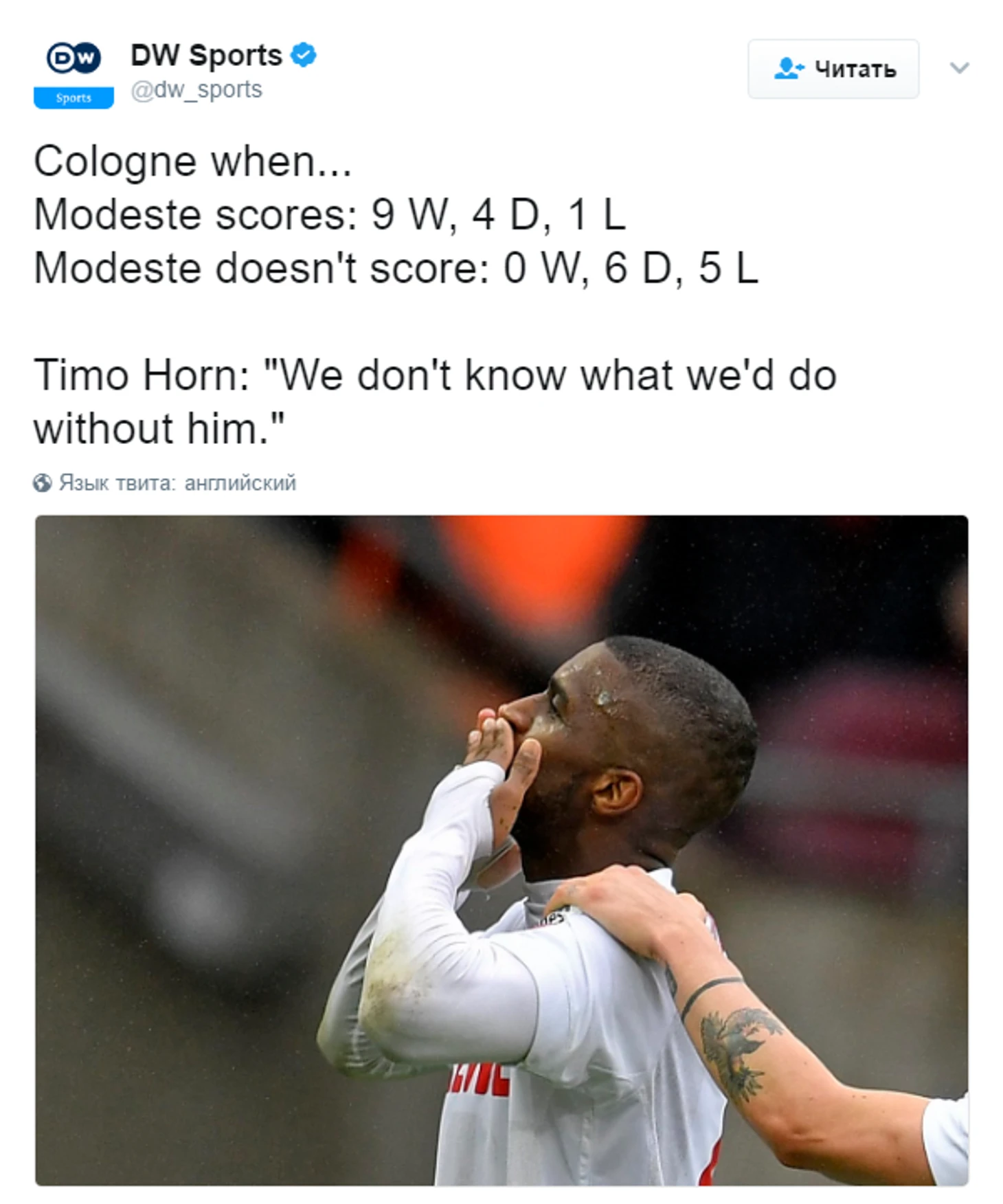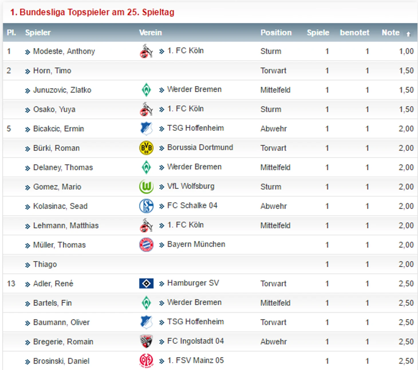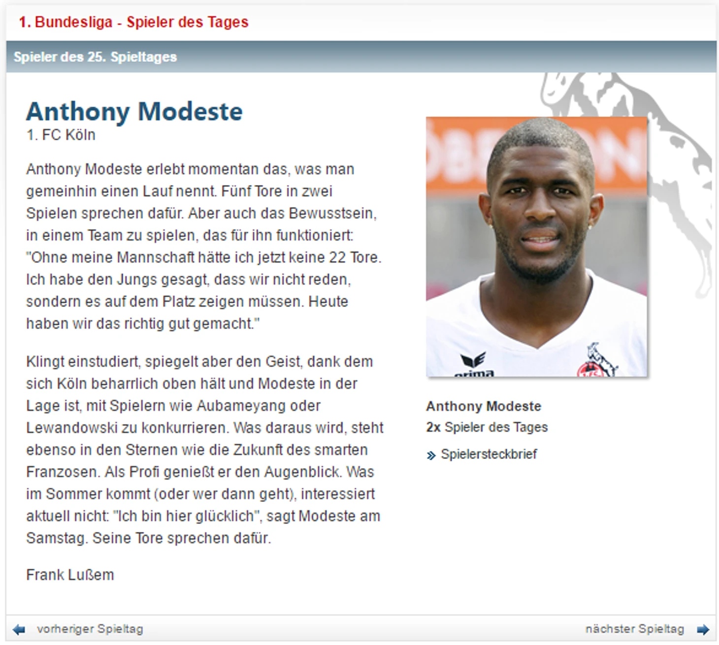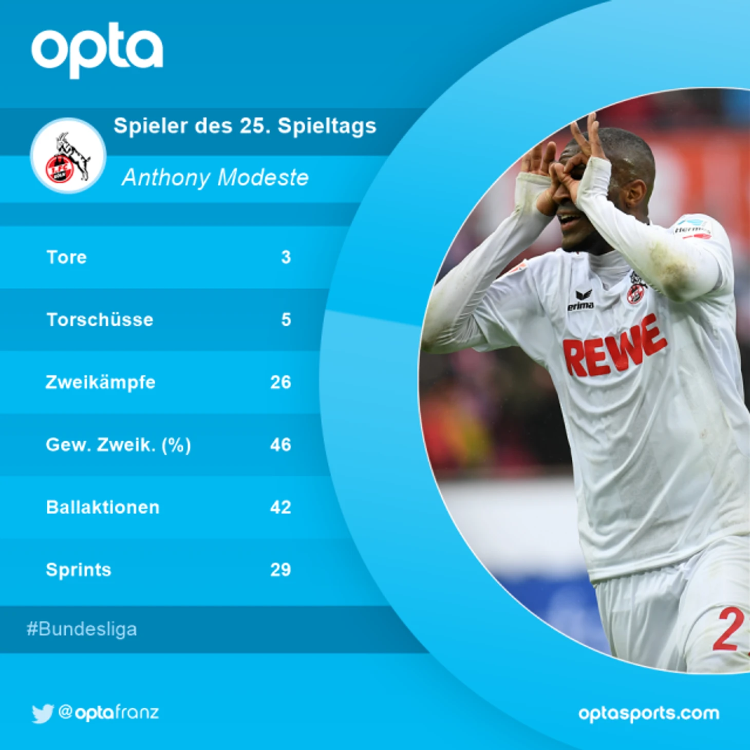 Антони Модест забил 22 гола после 25 туров – больше за «Кельн» на этом временном отрезке забивал лишь Клаус Аллофс в сезоне 1984-85 (26 мячей). Таким образом, Модест стал лучшим иностранным бомбардиром «Кельна» в истории клуба в Бундеслиге;