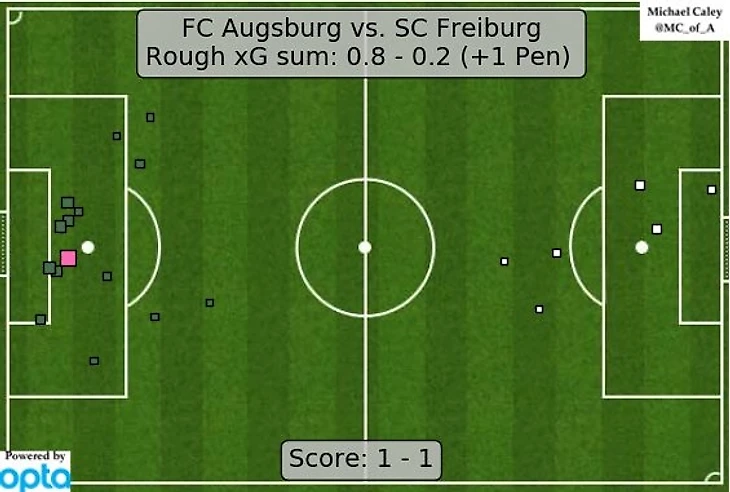 У «Фрайбурга» 8-ой мяч в сезоне забил Флориан Нидерлехнер (правда, с пенальти), сравнявшись по этому показателю с одноклубником Макси Филлипом, за «Аугсбург» же ответил боевой левый деф Костас Стафилидис.