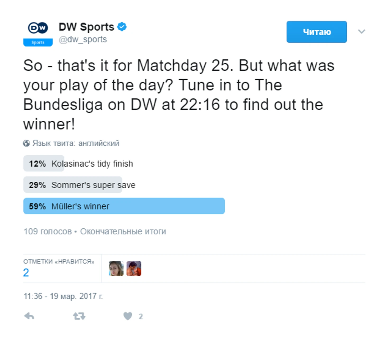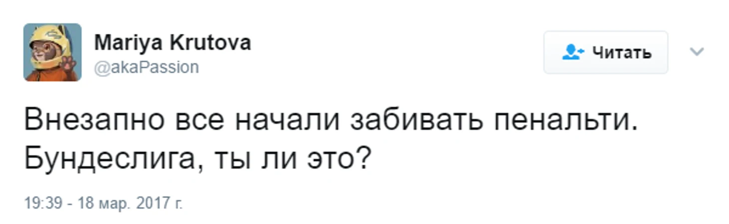 «Закусочный» матч 25-го тура должен запомниться двумя большими моментами и одним помельче. Первый из больших ― сэйв Яна Зоммера в конце первого тайма (настоятельно рекомендуется к про/пересмотру, как и голы Осако и Гриллича). Второй ― Томас Мюллер забил на выезде. Довольно слов.