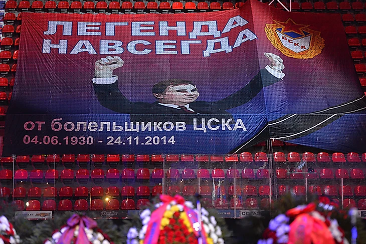 Перед входом №4, куда я, как и многие, заходил в прошлый четверг, собралась большая очередь. Так получилось, что начиналась она возле Константина Локтева, который ушел почти так же рано (в 63); проходила через Анатолия Тарасова (туда тоже несли цветы) и заканчивалась уже в фойе. В 11 утра люди покупали гвоздики, ехали до станции «Аэропорт» и шли по знакомому маршруту: сначала кассы и большое граффити с Виктором Тихоновым, высокий армейский забор, голубое здание бассейна и, наконец, сама арена. В дни матчей там зажигают красные и синие шары, перекупщики отводят в сторону, а военные музыканты встречают болельщиков маршами.