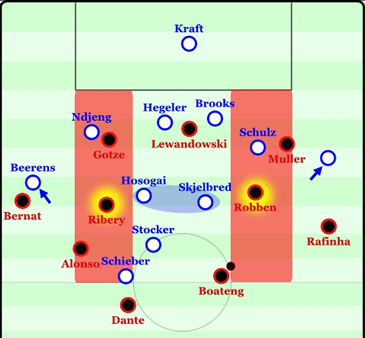 Этот эпизод показывает интересную вариацию построения атаки "Баварии". В этой игре Рибери и Роббен играли в большей степени на полуфлангах, а не на флангах, где нам привычно их видеть. Был расчет на то, что ЦП "Герты" смещаются на фланге, дабы сдержать наступление Берната и Рафиньи, что образует схему 6-2-2 в обороне у берлинцев, при которой ими легко манипулировать в полузащите и создавать преимущества. Именно из-за образующихся провалов в центральной зоне, Пеп решил выставит на полуфланги своих самых опасных игроков.