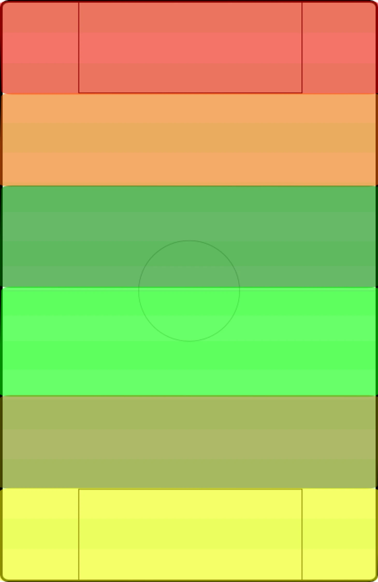 Красным/желтым обозначены зоны атакующей трети, светло/темно зеленым – полузащиты, оранжевым/оливковым – обороны. Цвета показывают разделение на уровень прессинга (красный – высокий атакующий прессинг, оранжевый - низкий).