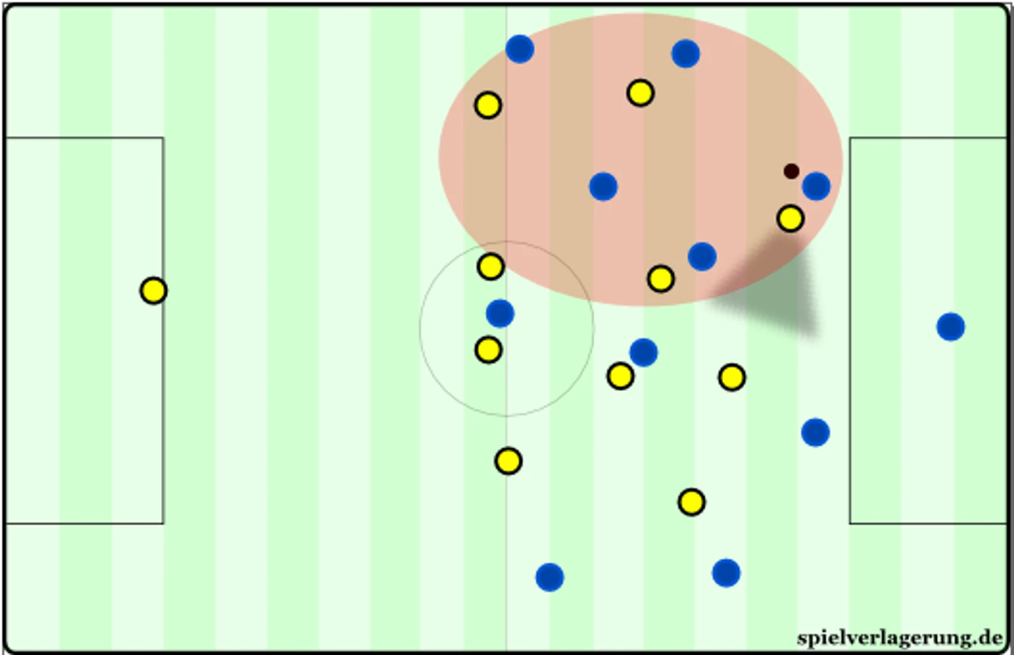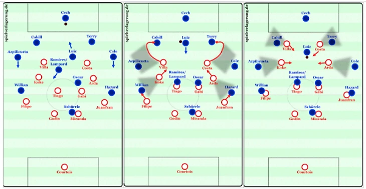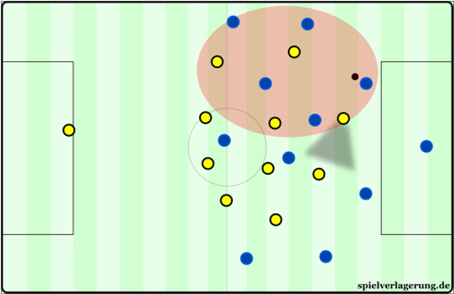 В приведенном выше примере, футболисты «Атлетико» довольно активно сместились со своих позиций ближе к флангам и заманили соперника в центр. Подготовка к прессингу изменяется в зависимости от динамики и игровой фазы.
